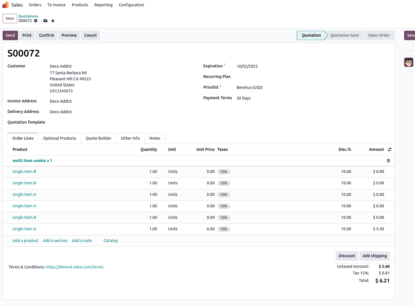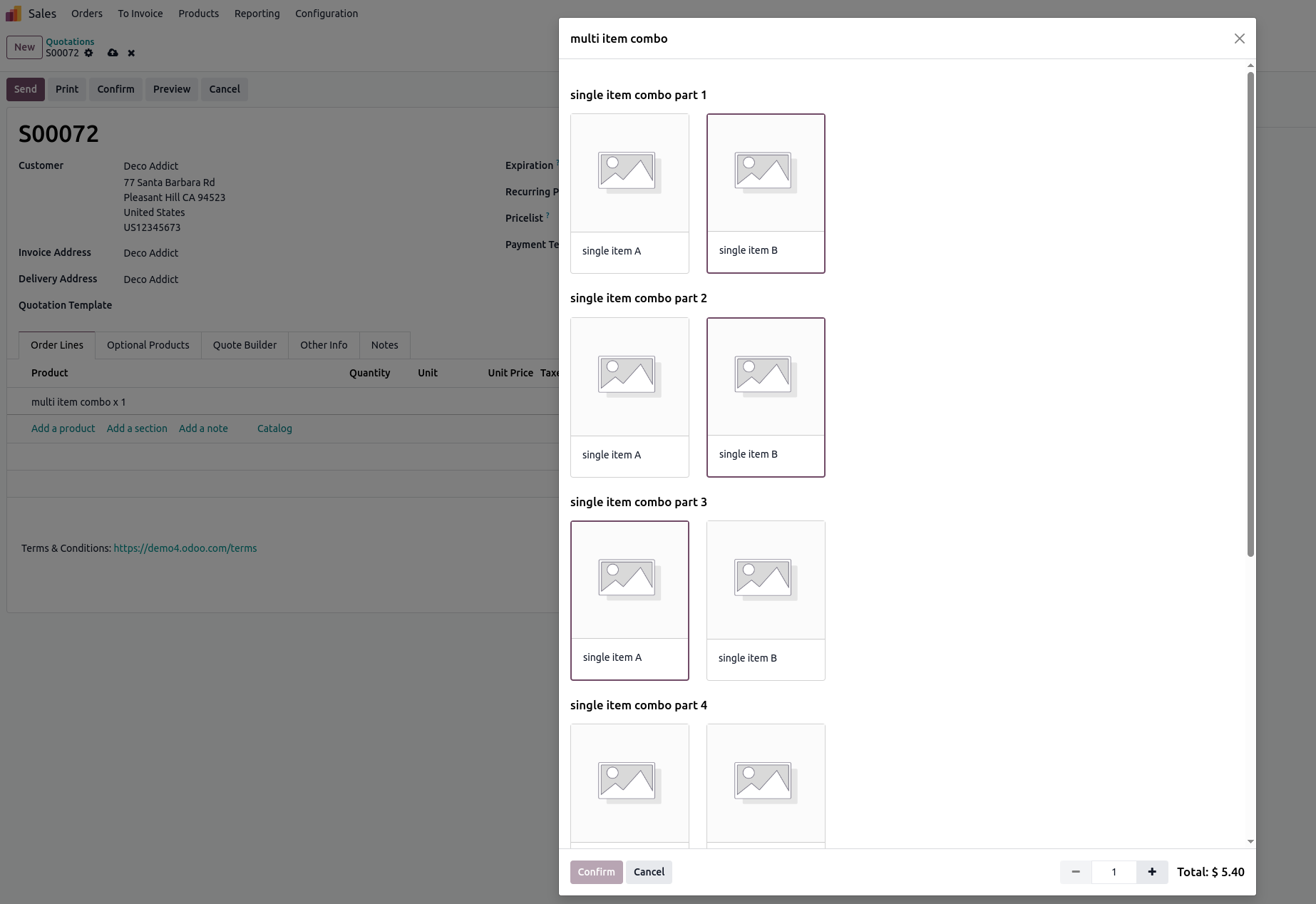 Die Benutzeroberfläche zum Hinzufügen einer solchen Kombination in einen Verkaufsauftrag würde in etwa so aussehen: