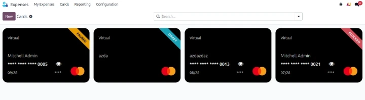 - Im Modul „Ausgaben“ (Expenses) den Bereich „Odoo Cards“ aktivieren.