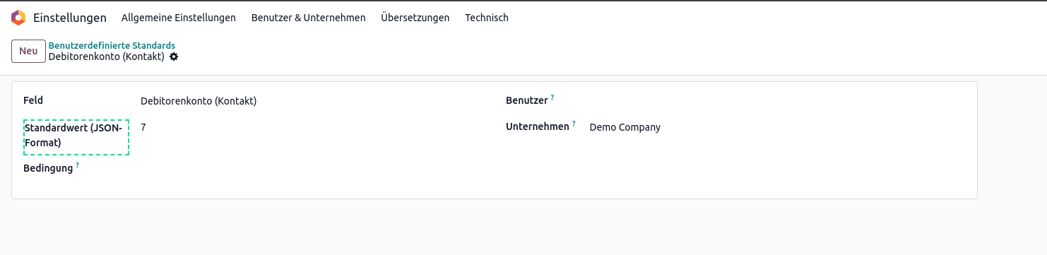 - Dort findest du Einträge, die Standardwerte (JSON-Format) für bestimmte Felder vordefinieren – darunter Konto für Debitorenkonto (Kontakt) und Kreditorenkonto (Kontakt).